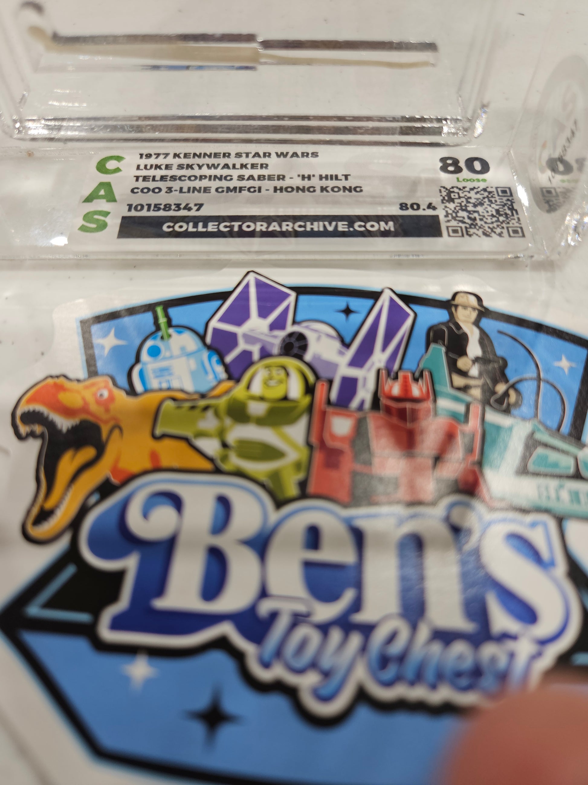 Wielding one of the most legendary accessories in Star Wars toy history, this 1977 Kenner Luke Skywalker with Double Telescoping Saber features the rare "H" hilt variant, 3-line GMFGI Hong Kong COO, and is graded CAS 80 (V-score: 80.4)—a grail-tier figure for vintage collectors.
