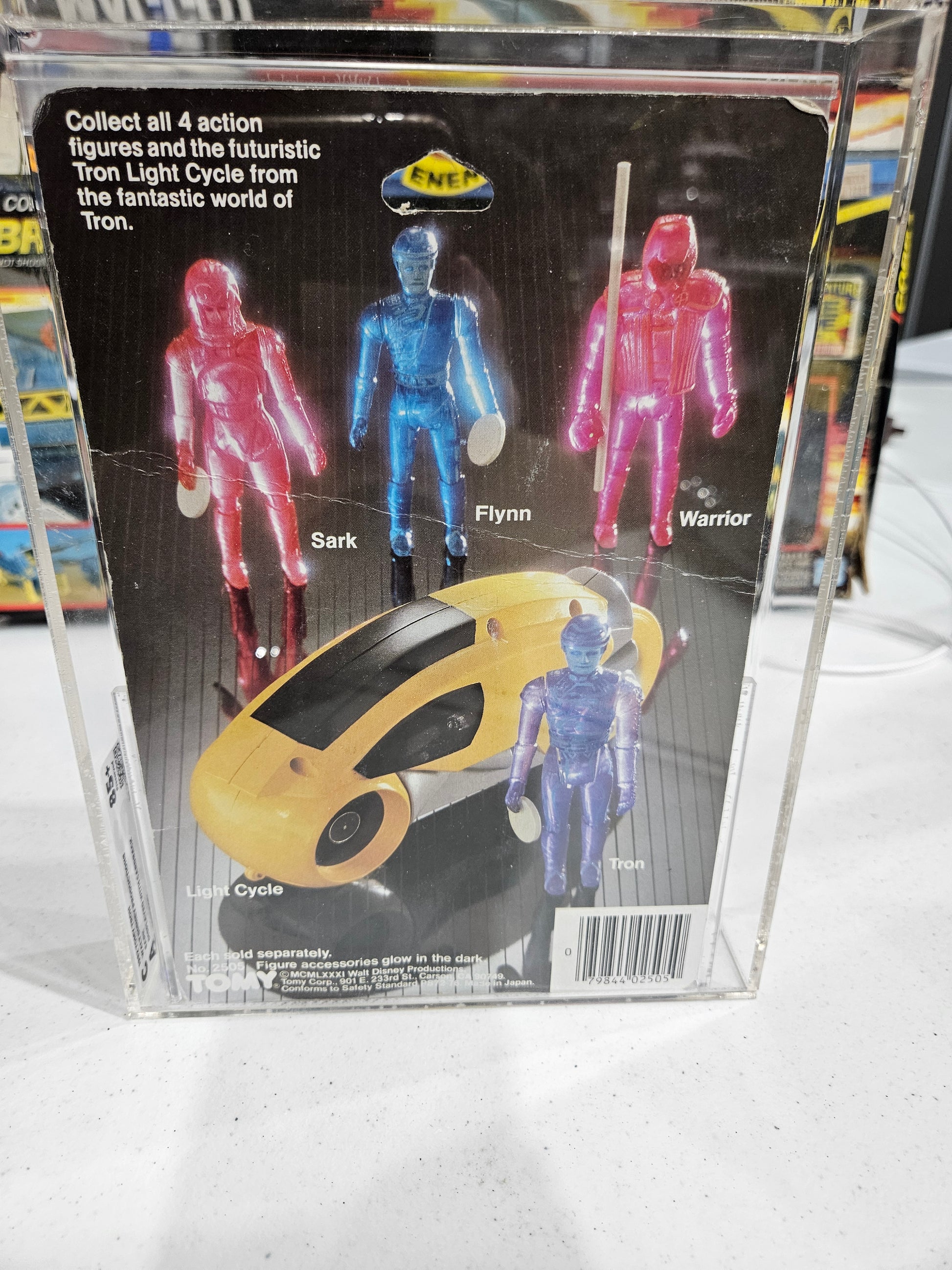 You're showcasing a glowing relic from the dawn of digital sci-fi—Sark, the villainous commander from Tron, released by Tomy in 1982, graded CAS 85+, and preserved with his original cardback bearing the Walt Disney Productions mark. This figure is a standout from one of the most visually unique toy lines of the early '80s.