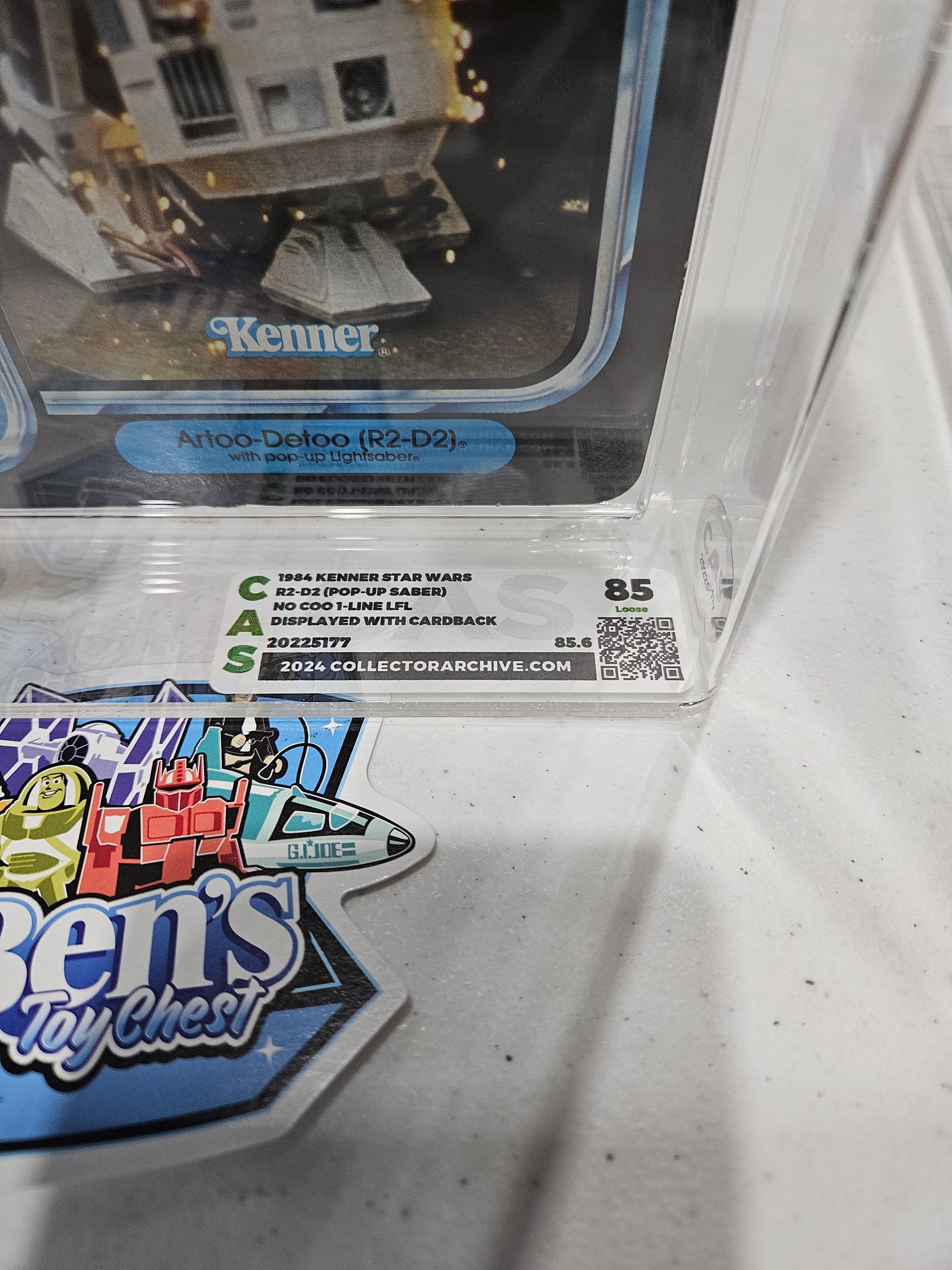 Here's a gem from the vintage vault—1984 Kenner Star Wars R2-D2 (Pop-up Saber), featuring the elusive No COO 1-line LFL marking and displayed with its original cardback! With a grade score of 85.6, this piece is a top-tier collectible that blends character charm with production rarity.