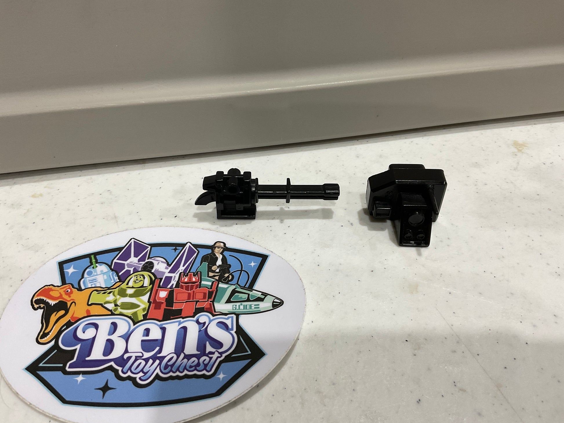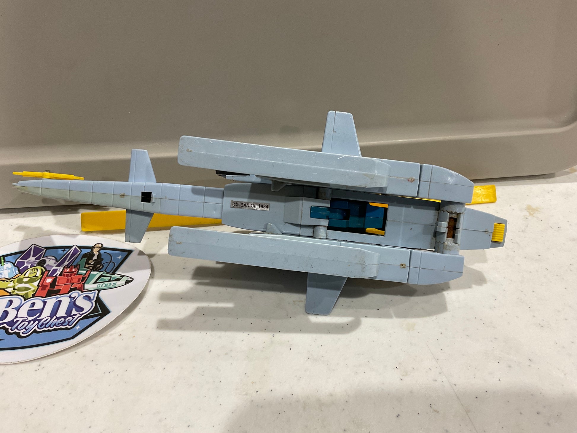 This Vintage Figure is known as a repurposed Bandai toy from a failed anime mech series, used by Hasbro as Autobot Whirl. This figure in particular is a bit worse for ware, with discoloring, rusted waist axle, scratches, and loose joints; although nothing is broken, including his head-antenna, which is commonly found missing. He is comes with two of his four accessories, as is shown in the images. Please contact us if you have any questions regarding the product.