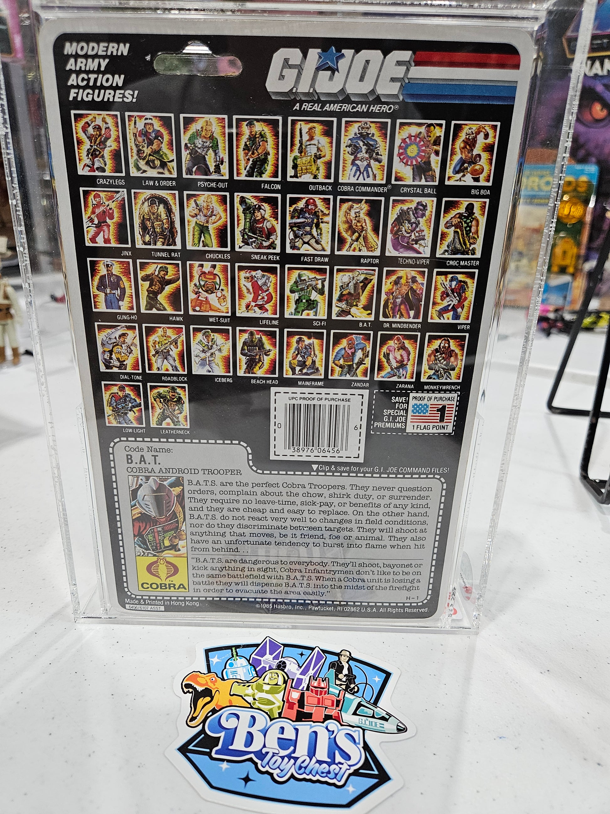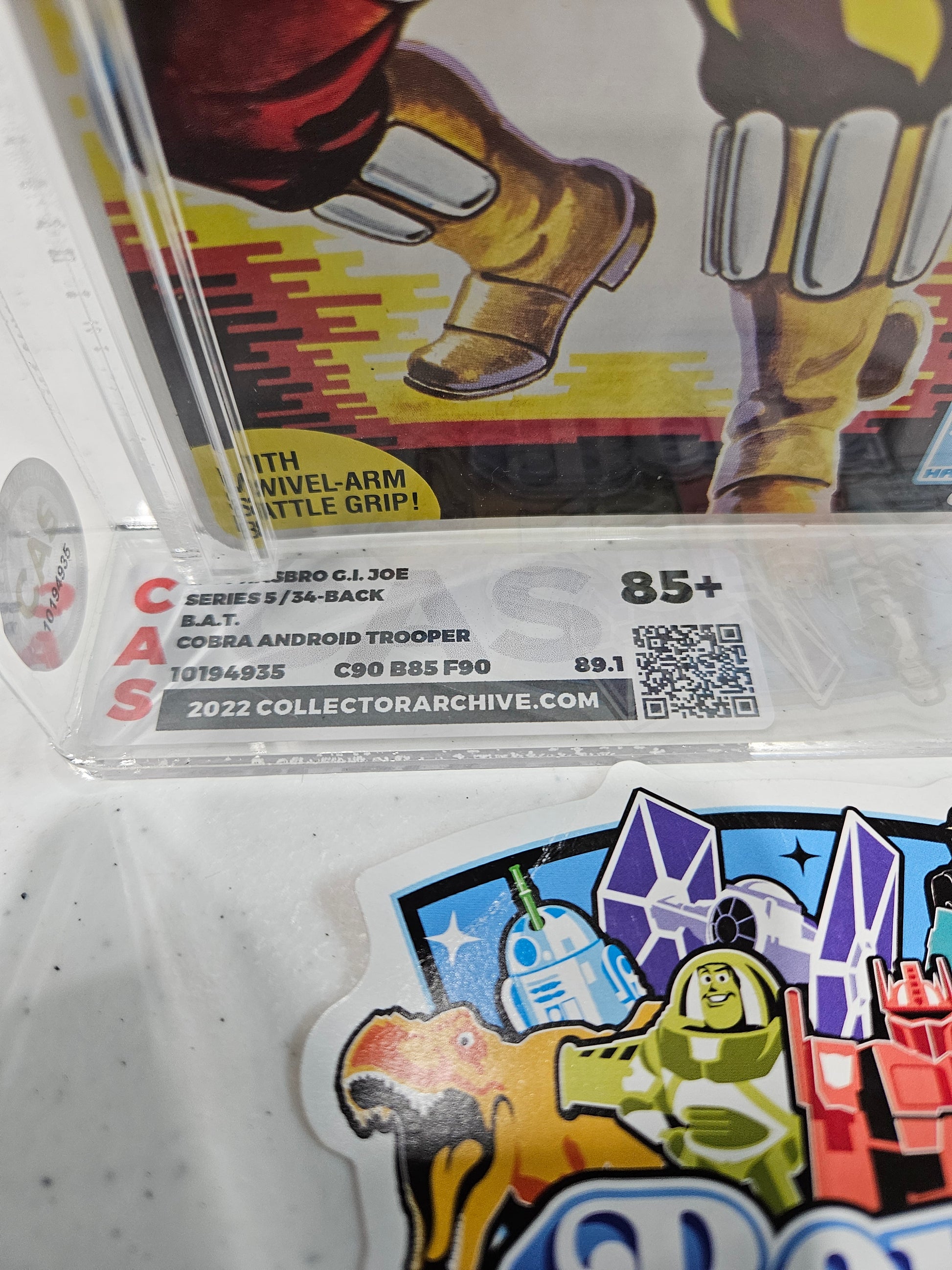 A robotic terror with pristine preservation! 🤖 The 1985 Hasbro G.I. Joe B.A.T. (Battle Android Trooper), graded CAS 85+ with subgrades C90 B85 F90, is a top-tier example from Series 5 on the 34-back card—a fan-favorite Cobra troop known for its lenticular chest sticker and interchangeable weapon limbs.