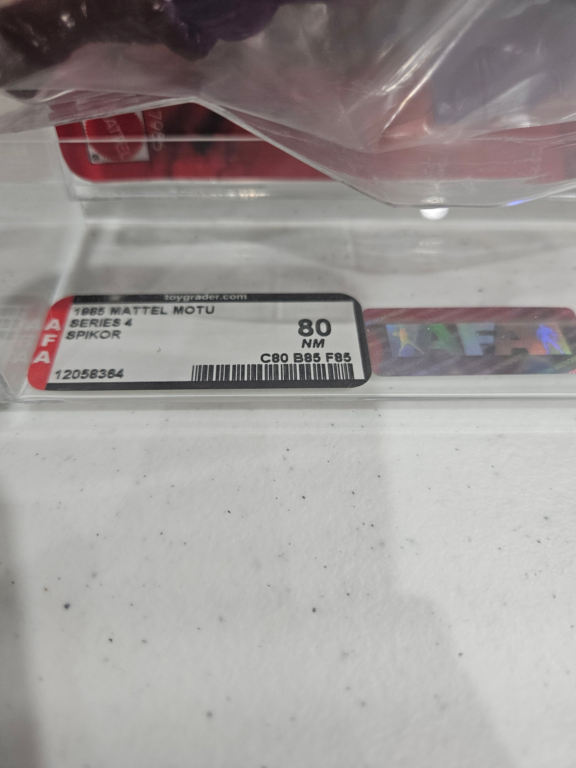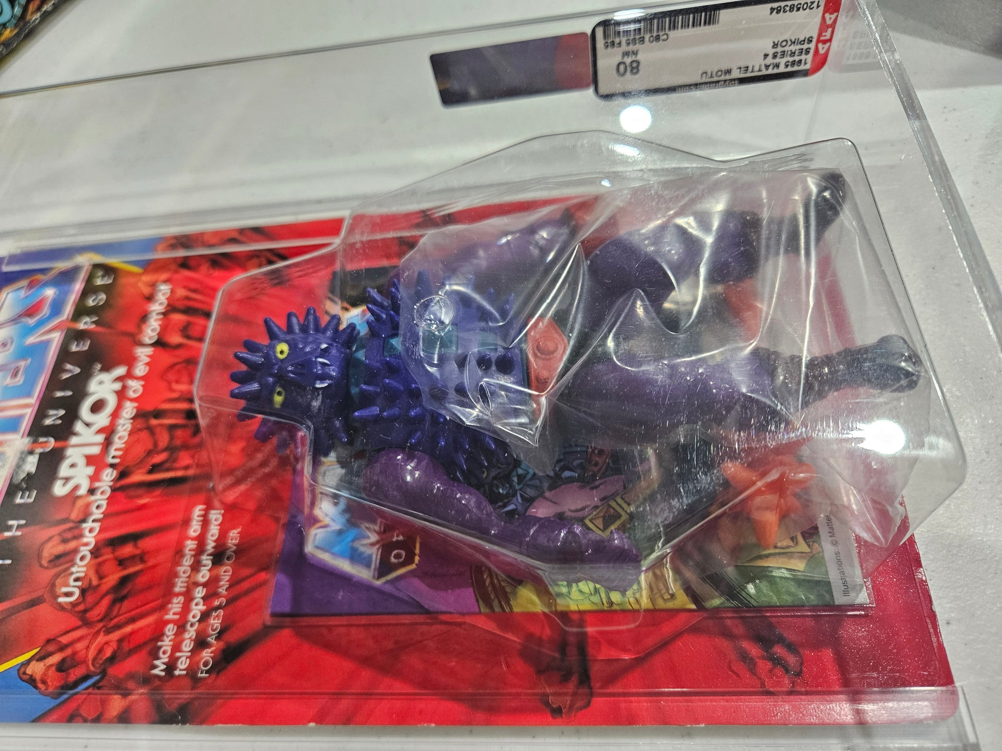 You’ve got a sharp mid-’80s Masters of the Universe villain here — the 1985 Mattel MOTU Spikor, graded AFA 80 NM with subgrades C80 / B85 / F85, from Series 4. This is the original release of the “Untouchable Master of Evil Combat,” and it’s a great example of the line’s shift toward more outlandish, gimmick-driven characters in the mid-run years.