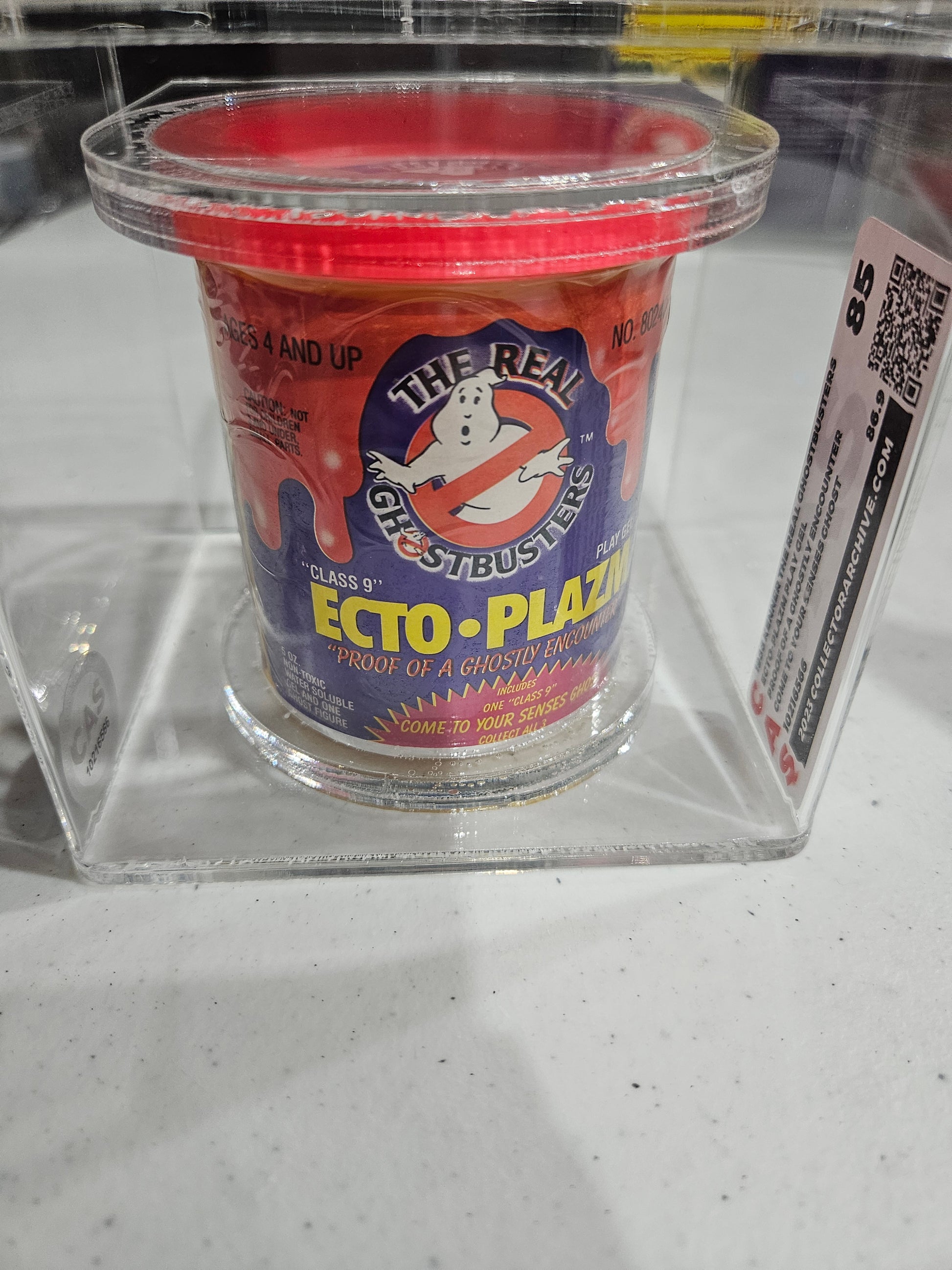 A slimy specter sealed in minty mischief! 💜 The 1986 Kenner The Real Ghostbusters Ecto-Plazm Play Gel, graded CAS 85, is a gooey grail from the original toy line—this version includes the elusive “Come to Your Senses” Ghost, a Class 9 mini-figure packed inside the canister as proof of a ghostly encounter. With its vibrant purple gel and sealed packaging, this piece is a nostalgic knockout for slime-era collectors.