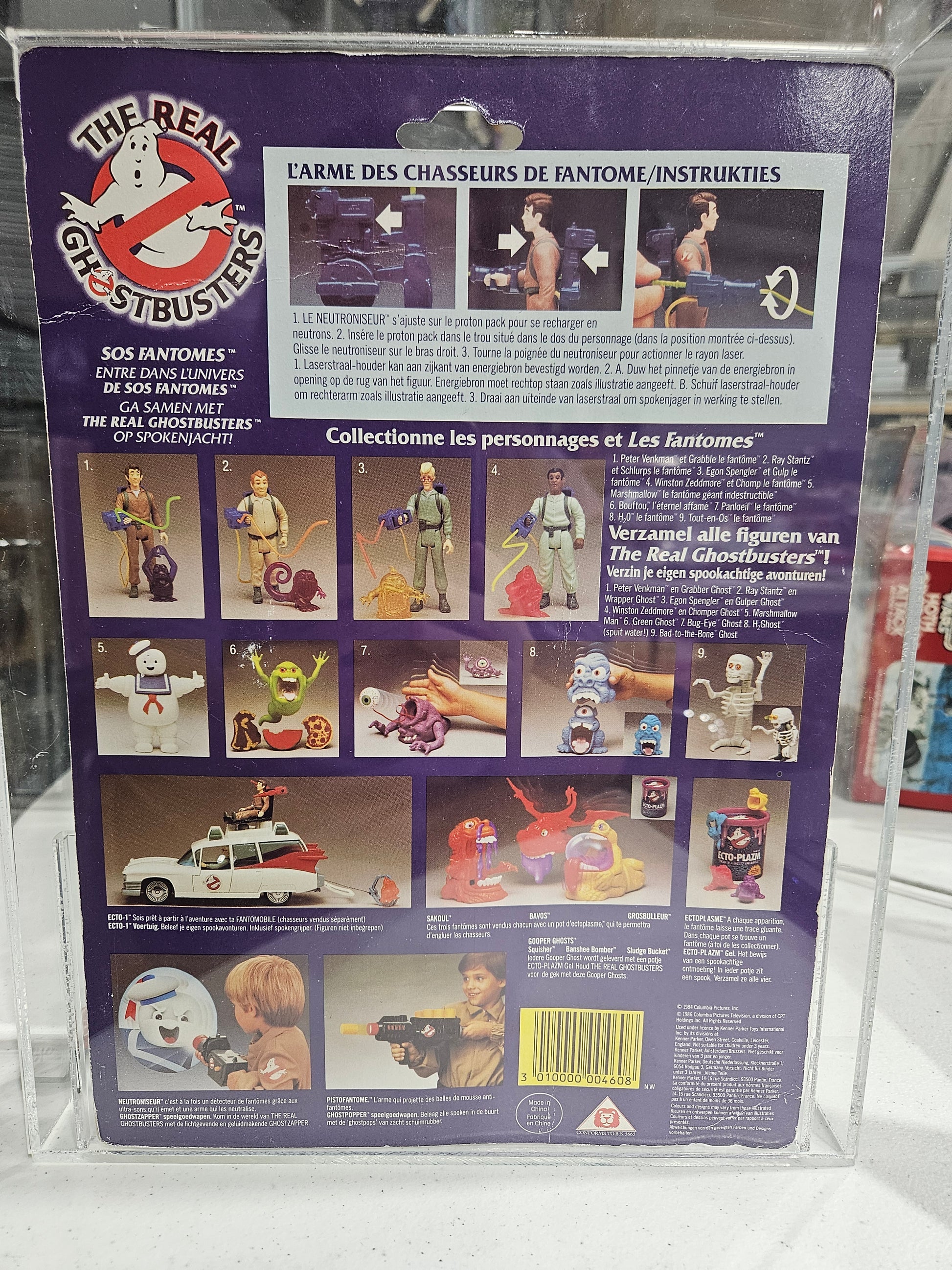 The 9-back European card features multilingual branding (S.O.S. Fantômes) and a cross-sell grid of early figures like Egon, Ray, and Peter.