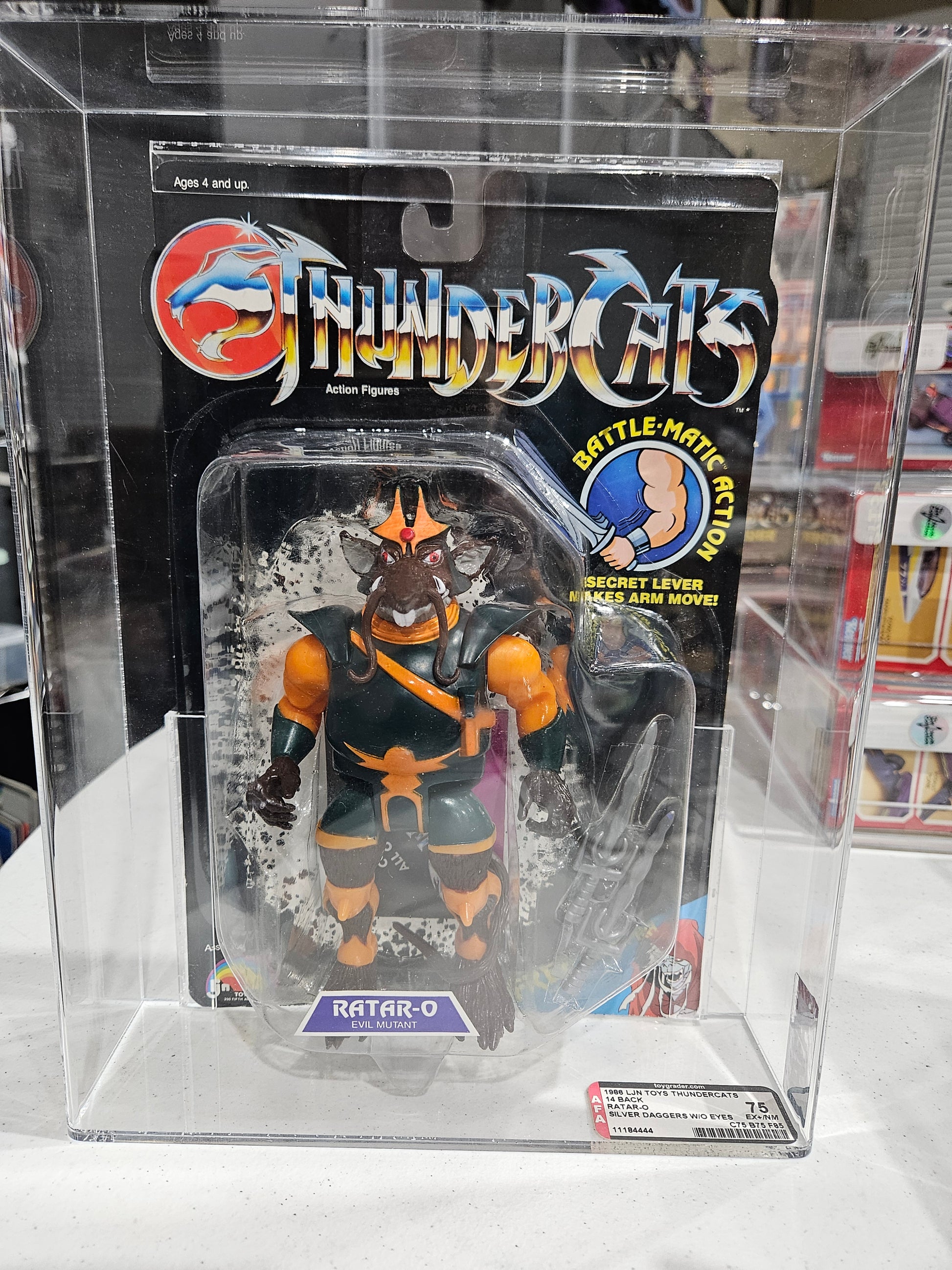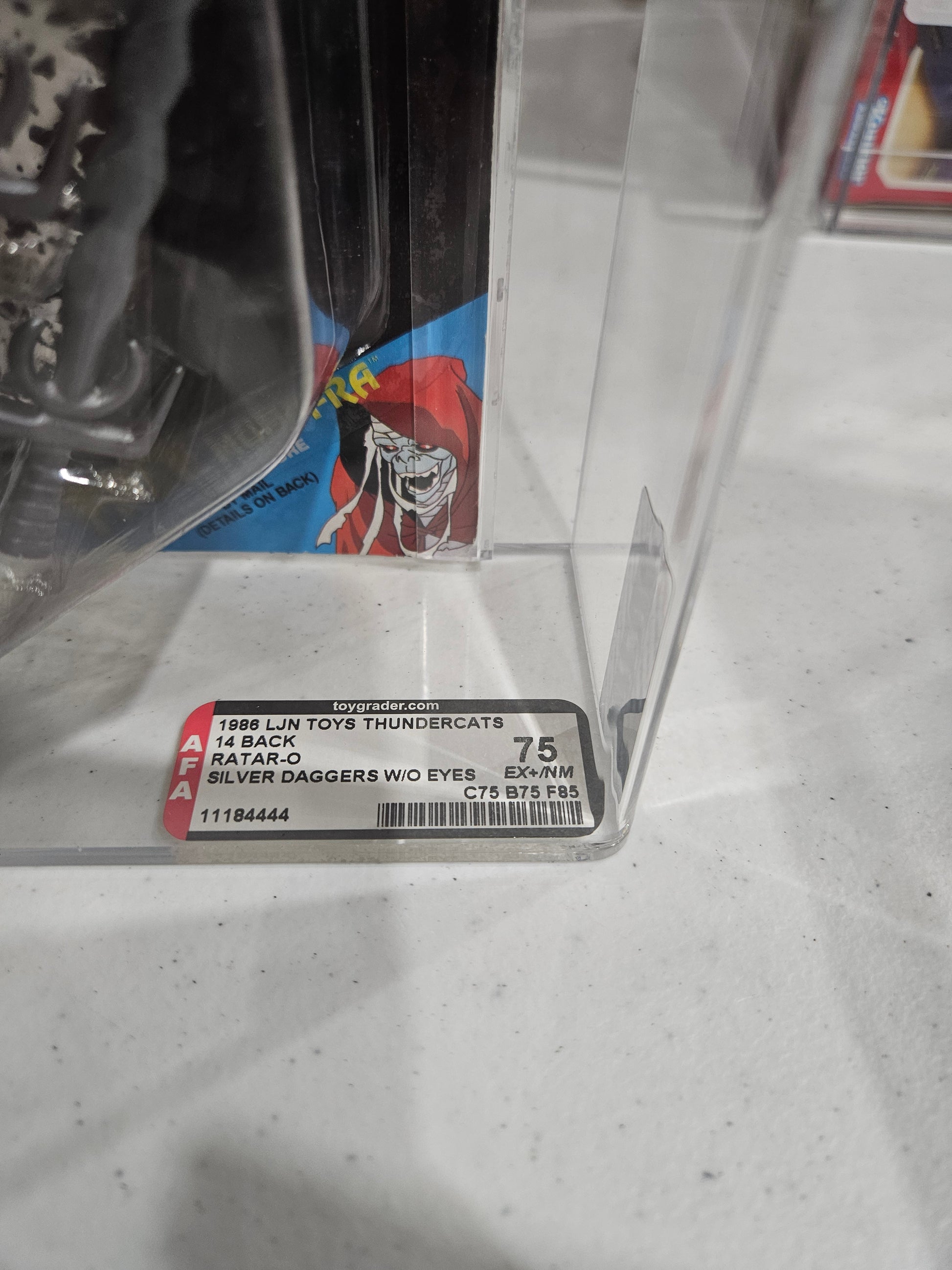 A rodent rogue with grading grit and variant mystique! đ The 1986 LJN Toys Thundercats Ratar-O, graded AFA 75 EX+/NM with subgrades C75/B75/F85, is a mid-tier archival example from the 14-back card waveâfeaturing the silver daggers variant and the elusive âwithout eyesâ paint omission, a detail thatâs sparked debate among variant hunters and production historians.