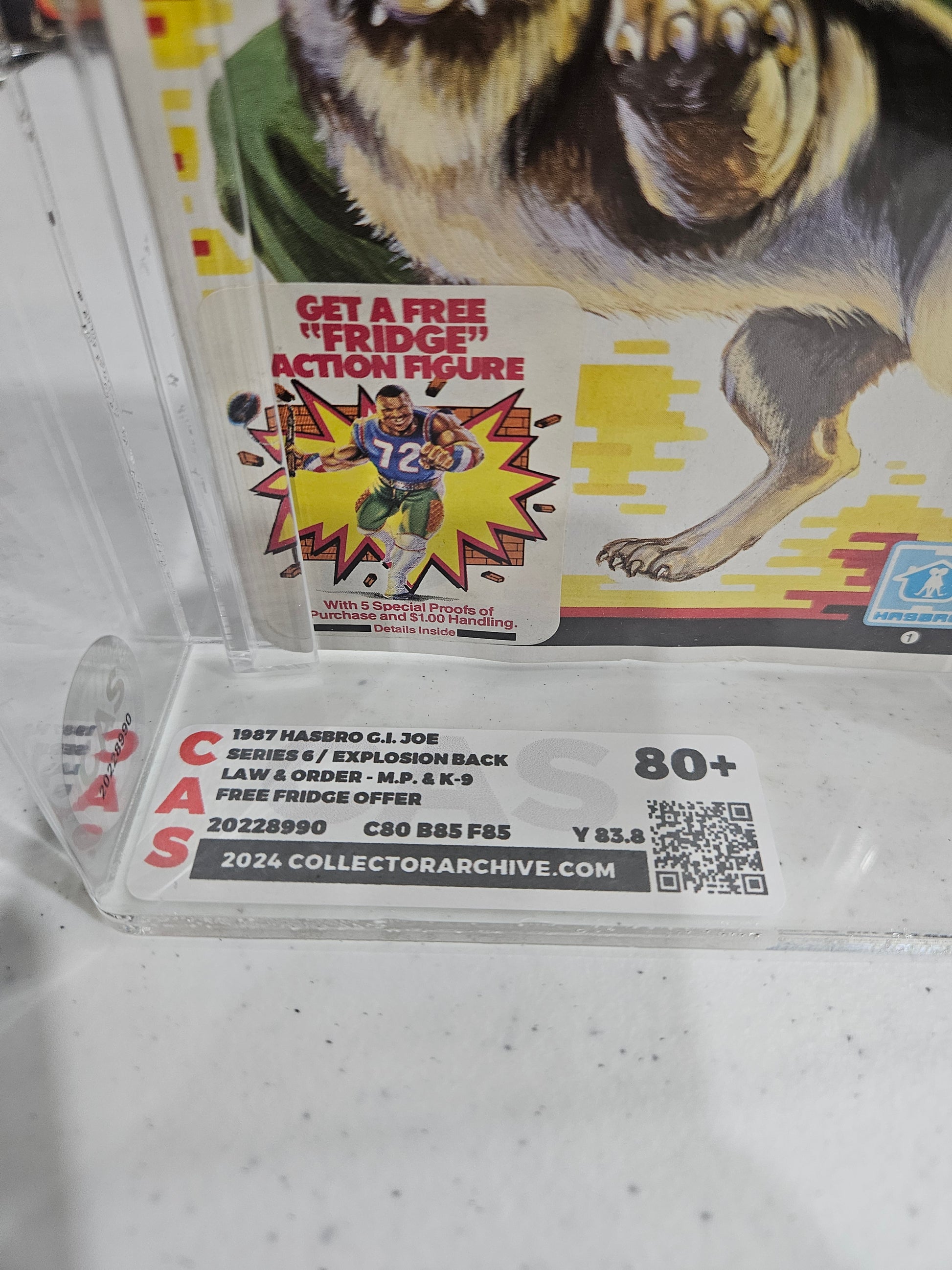 You're showcasing a classic duo from Series 6 (1987)—Law & Order, the Military Police and K-9 team, graded CAS 80+ with subgrades C80/B85/F85, sealed on an explosion-back card featuring the “Free Fridge Offer” sticker. This figure set blends realism, character lore, and promotional nostalgia into one highly collectible package.
