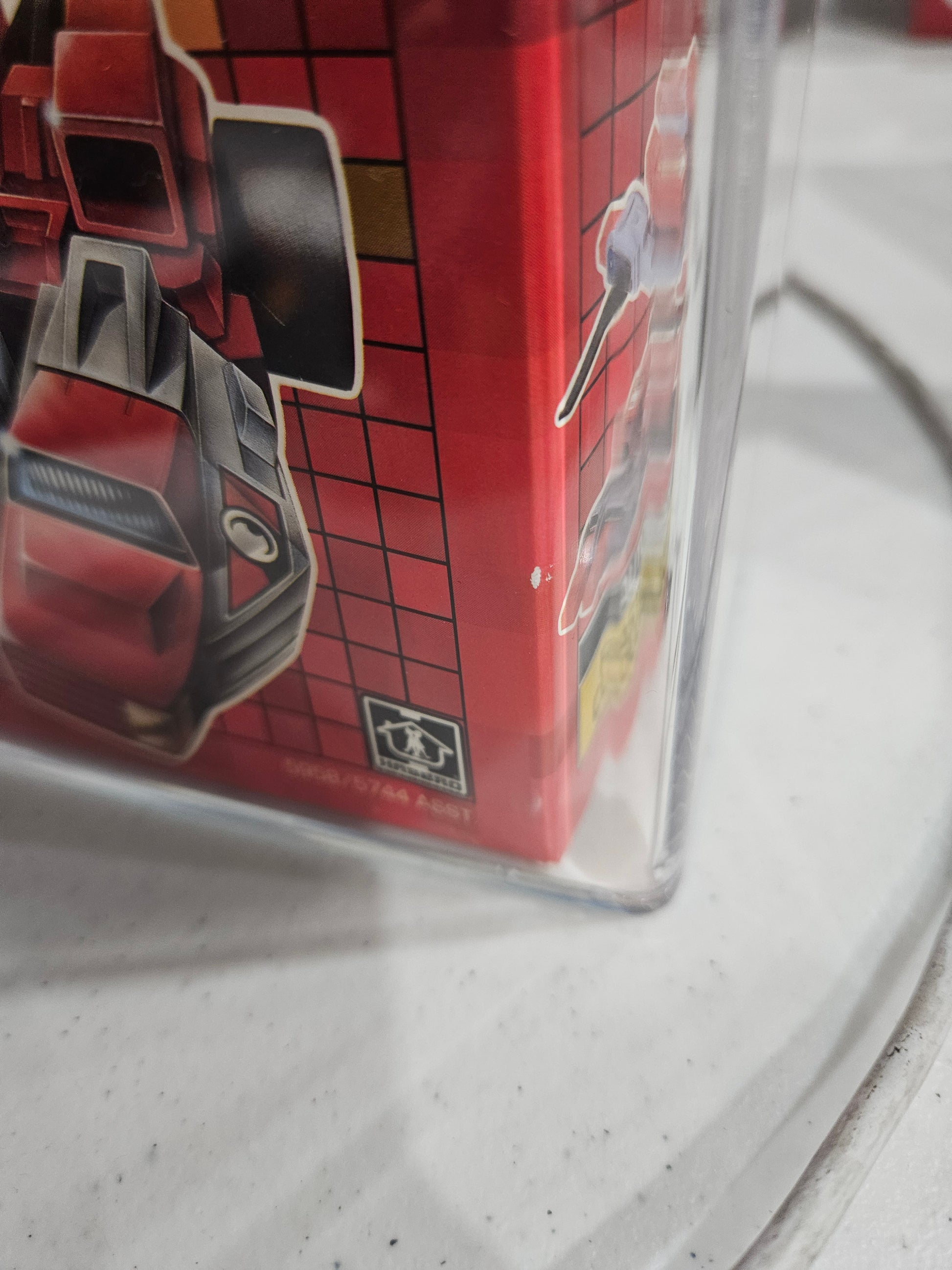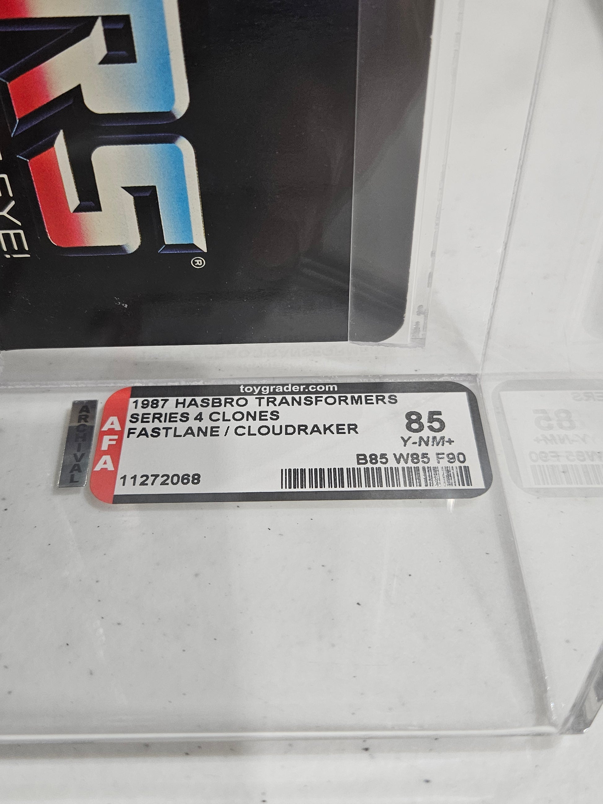 A twin-speed strike team with top-tier grading! 🚀 The 1987 Hasbro Transformers Fastlane & Cloudraker, graded AFA 85 Y-NM+ with subgrades B85/W85/F90, are part of Series 4’s Autobot Clones—a unique gimmick line where each pair shares a robot mode but transforms into different alt modes. Fastlane becomes a dragster, Cloudraker a jet, and together they represent the Autobot answer to Decepticon duplicity.