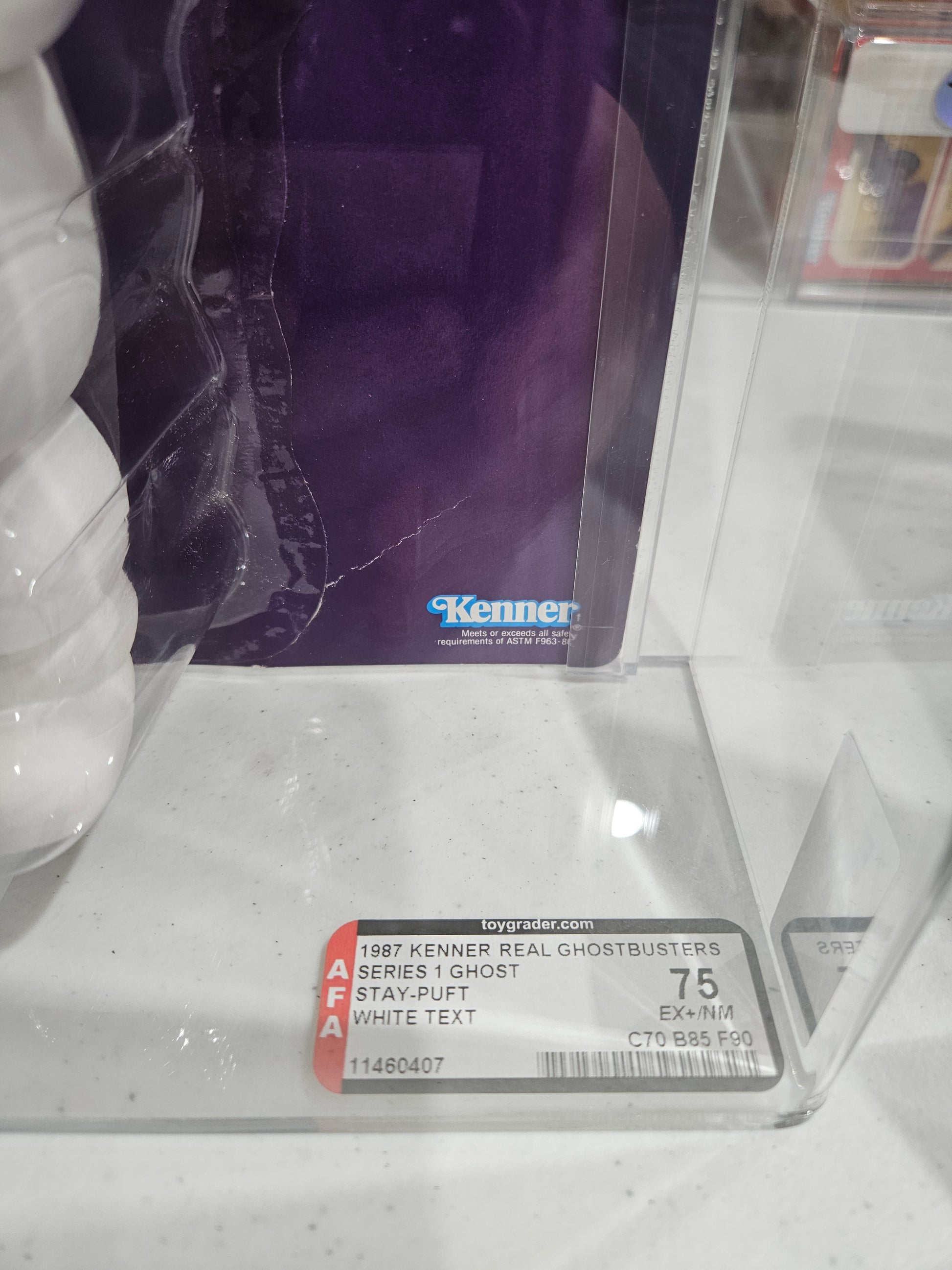 A marshmallow menace with archival muscle! 🍥 The 1987 Kenner The Real Ghostbusters Stay-Puft Marshmallow Man, graded AFA 75 EX+/NM with subgrades C70/B85/F90, is a standout from Series 1, featuring the rarer white text cardback—a packaging variant that’s especially prized among early-line purists and variant hunters.