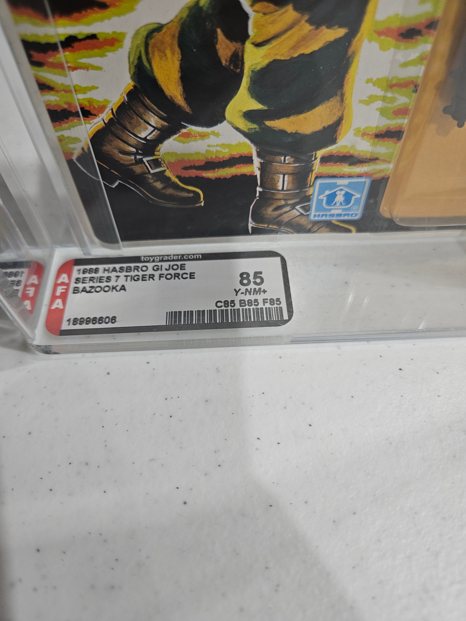 A jungle-camouflaged heavy weapons specialist with elite grading! 🐅 The 1988 Hasbro G.I. Joe Tiger Force Bazooka, graded AFA 85 Y-NM+ with subgrades C85/B85/F85, is a top-tier example from Series 7, and part of the vibrant Tiger Force sub-team—a repaint line that gave classic characters a bold new look for jungle warfare.