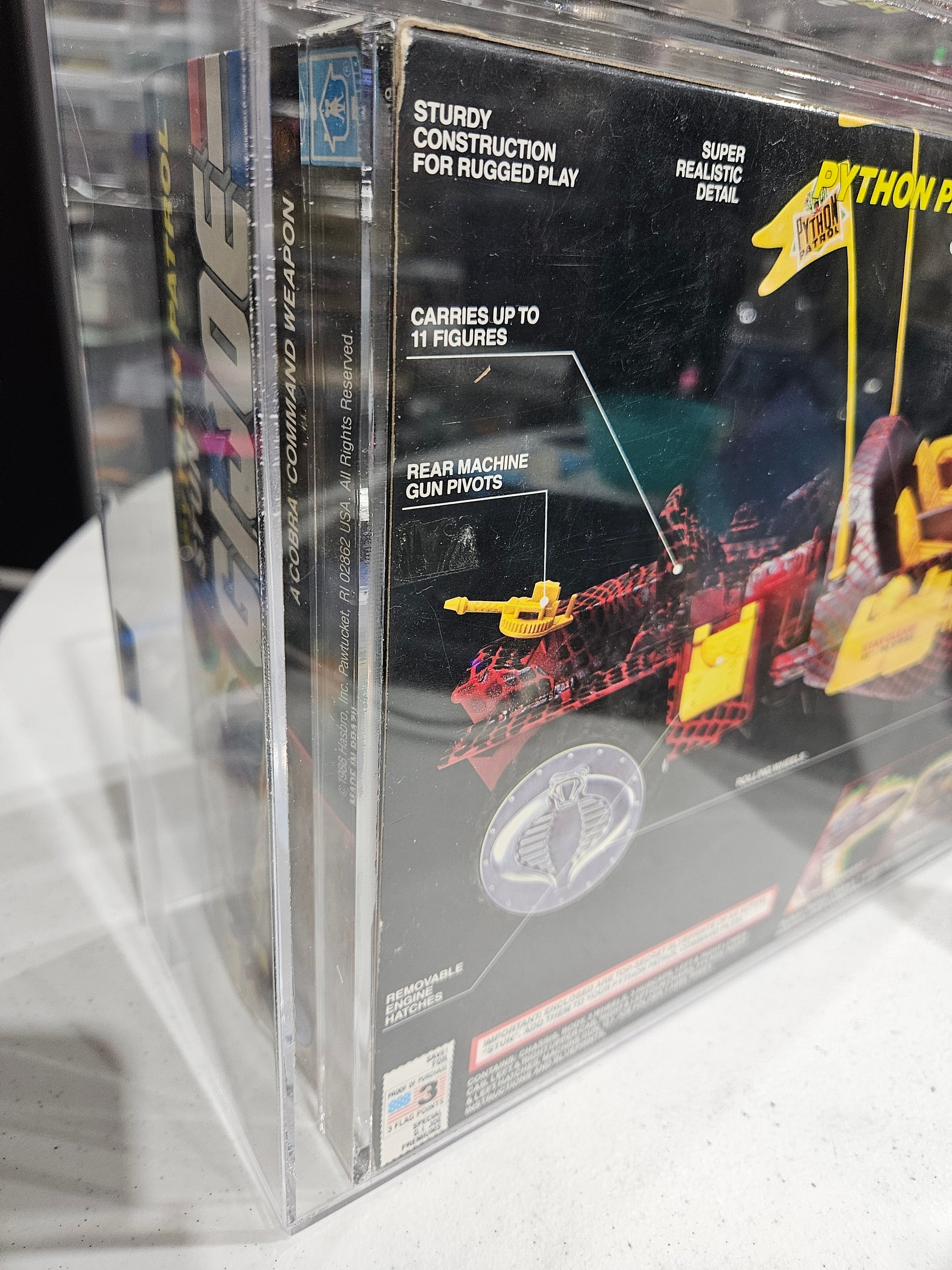 A stealth-strike vehicle with venomous vintage appeal! đ The 1989 Hasbro G.I. Joe Python Patrol STUN, graded AFA 80 Q-NM, is a rare and highly collectible repaint of the original Cobra STUNânow cloaked in Python Patrolâs signature black, red, and yellow grid camo. This Series 8 release is part of Hasbroâs late-80s sub-line that gave Cobra vehicles a covert makeover, and your Qualified Near Mint grade signals strong archival condition with minor packaging caveats.