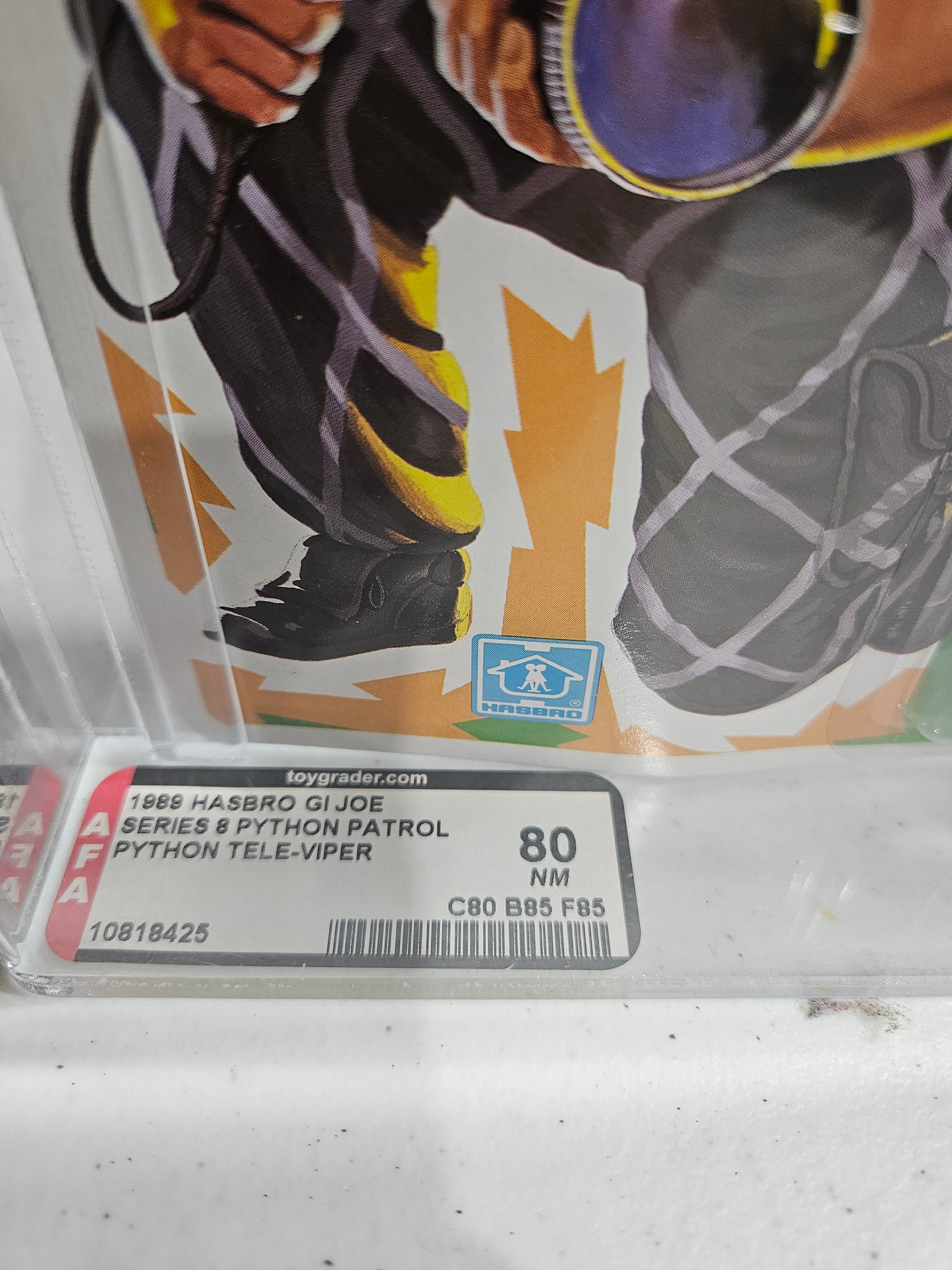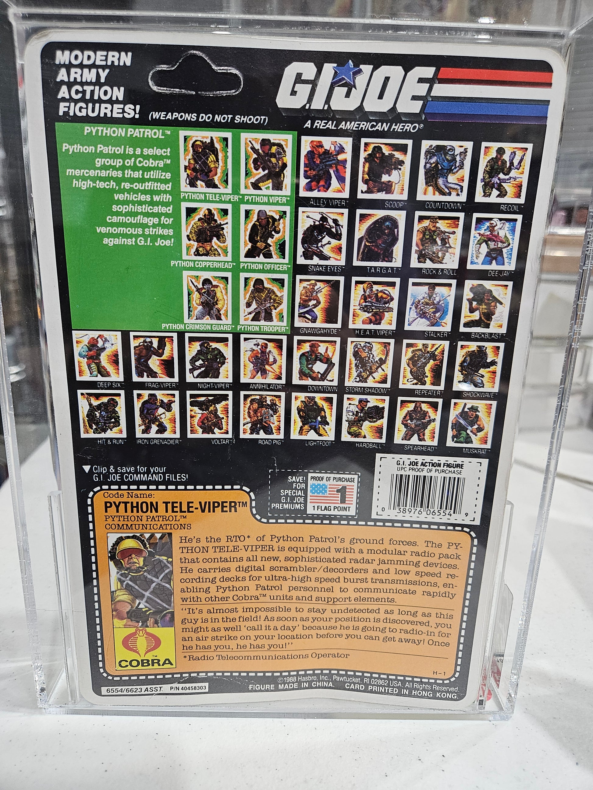 A covert comms specialist with venomous flair! š The 1989 Hasbro G.I. Joe Python Patrol Tele-Viper, graded AFA 80 NM with subgrades C80/B85/F85, is a striking repaint of the original 1985 Tele-Viperāthis time reimagined for Cobraās jungle warfare sub-team, Python Patrol, in Series 8.