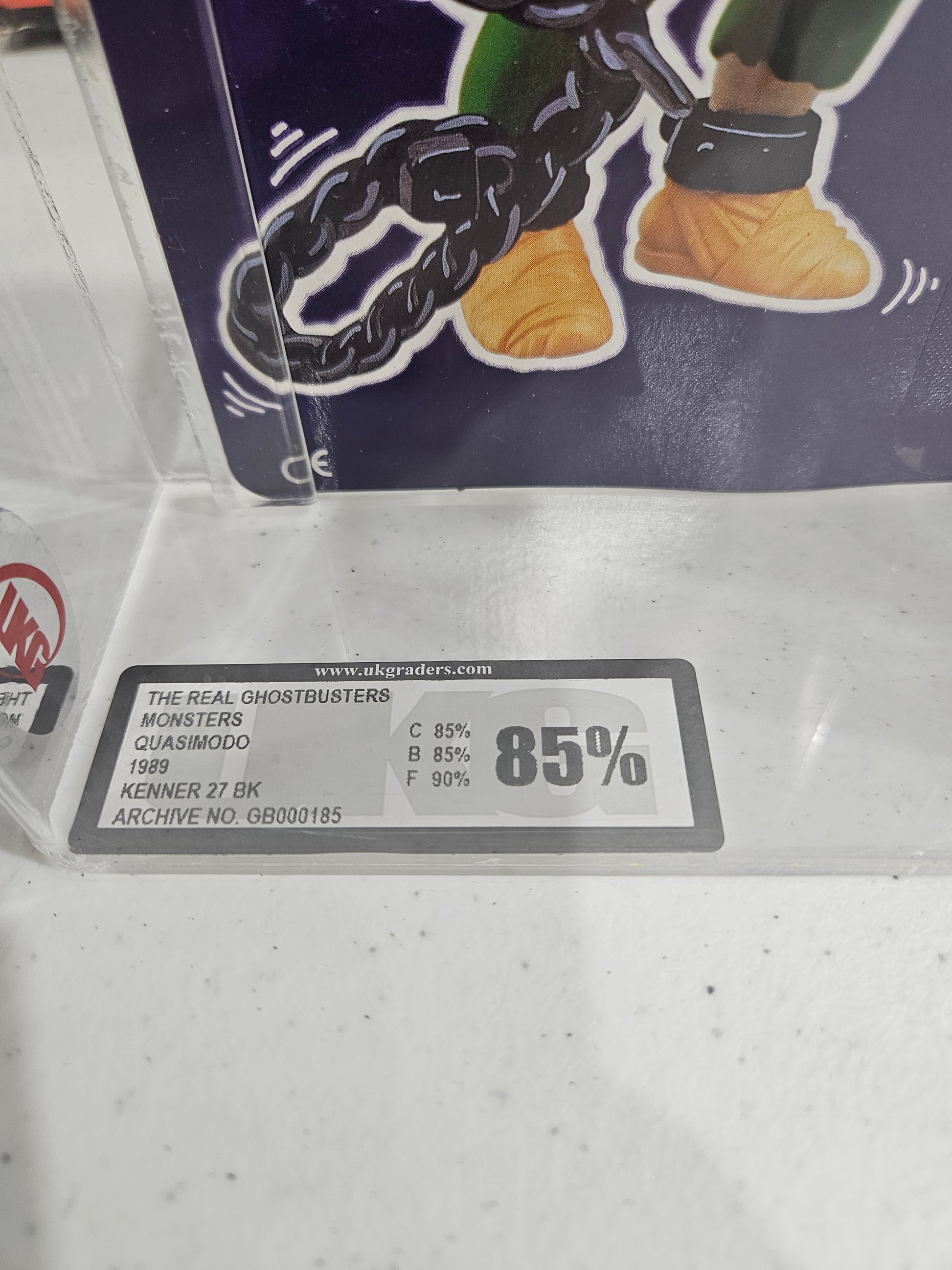 You’ve got a fantastic high-grade example from Kenner’s wonderfully weird The Real Ghostbusters “Monsters” sub-line — the 1989 Quasimodo Monster, graded UKG 85% with subgrades C85% / B85% / F90%, sealed on a 27-back card. This is one of the more unusual and characterful figures from the Monsters assortment, and your high figure subgrade makes it especially appealing.
