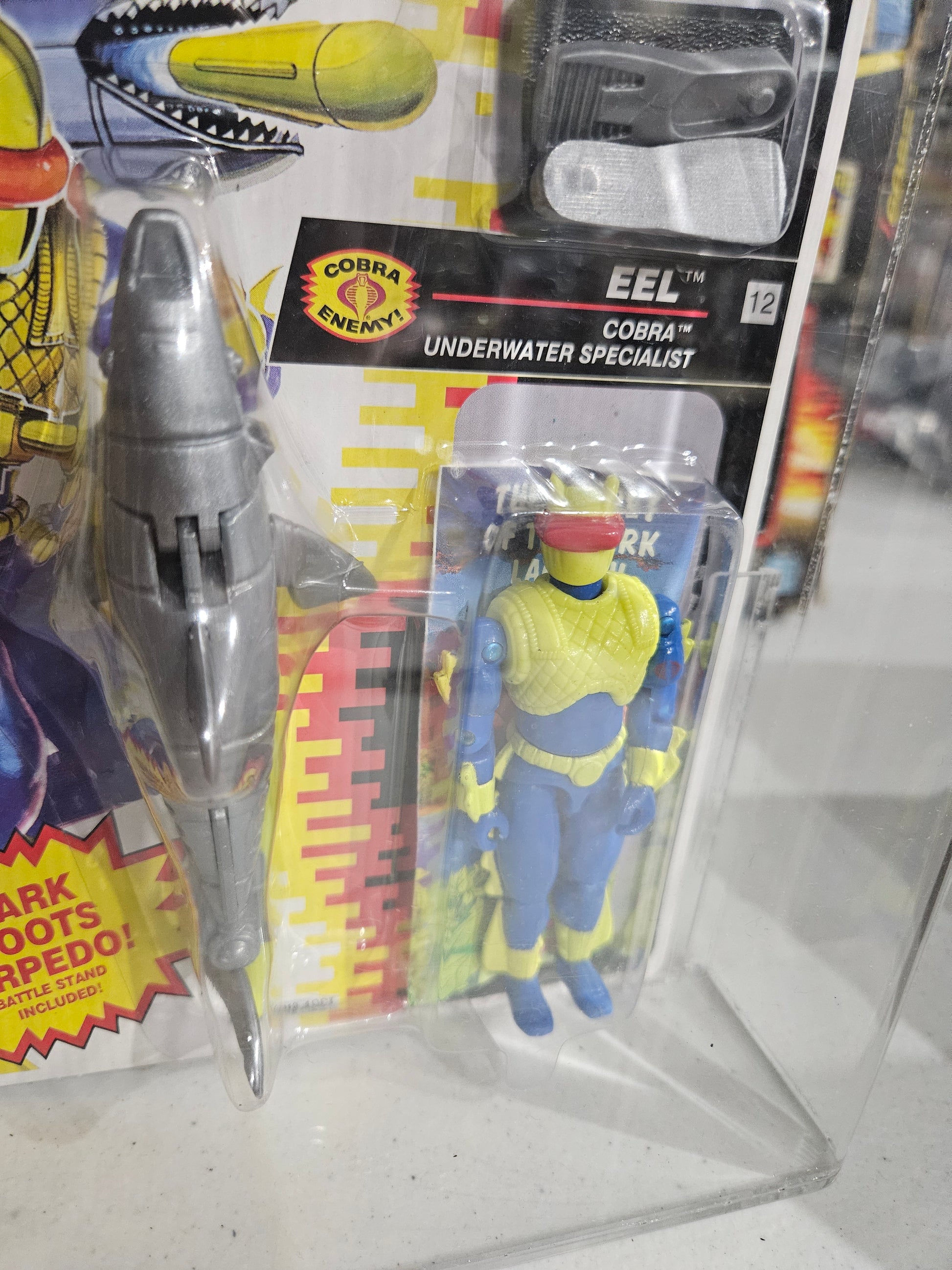 You’ve got a late-run Cobra diver here that’s both visually striking and increasingly hard to find sealed: the 1992 Hasbro G.I. Joe Eel (v2), graded AFA 75 EX+/NM with subgrades C75 / B85 / F85, from Series 11. This is the neon-accented successor to the original 1985 Eel, part of the early ’90s push toward brighter, more toy-aisle-grabbing designs.