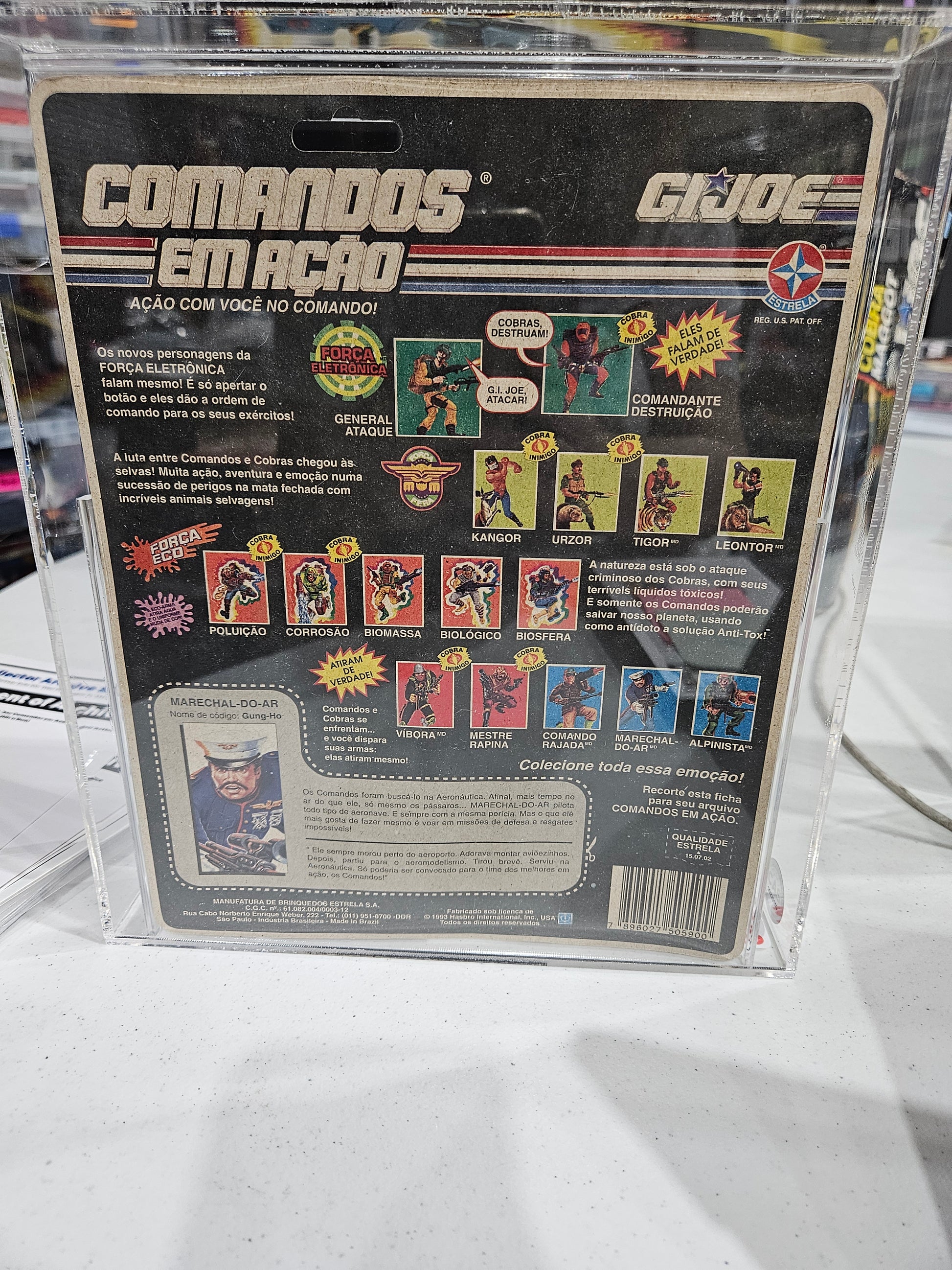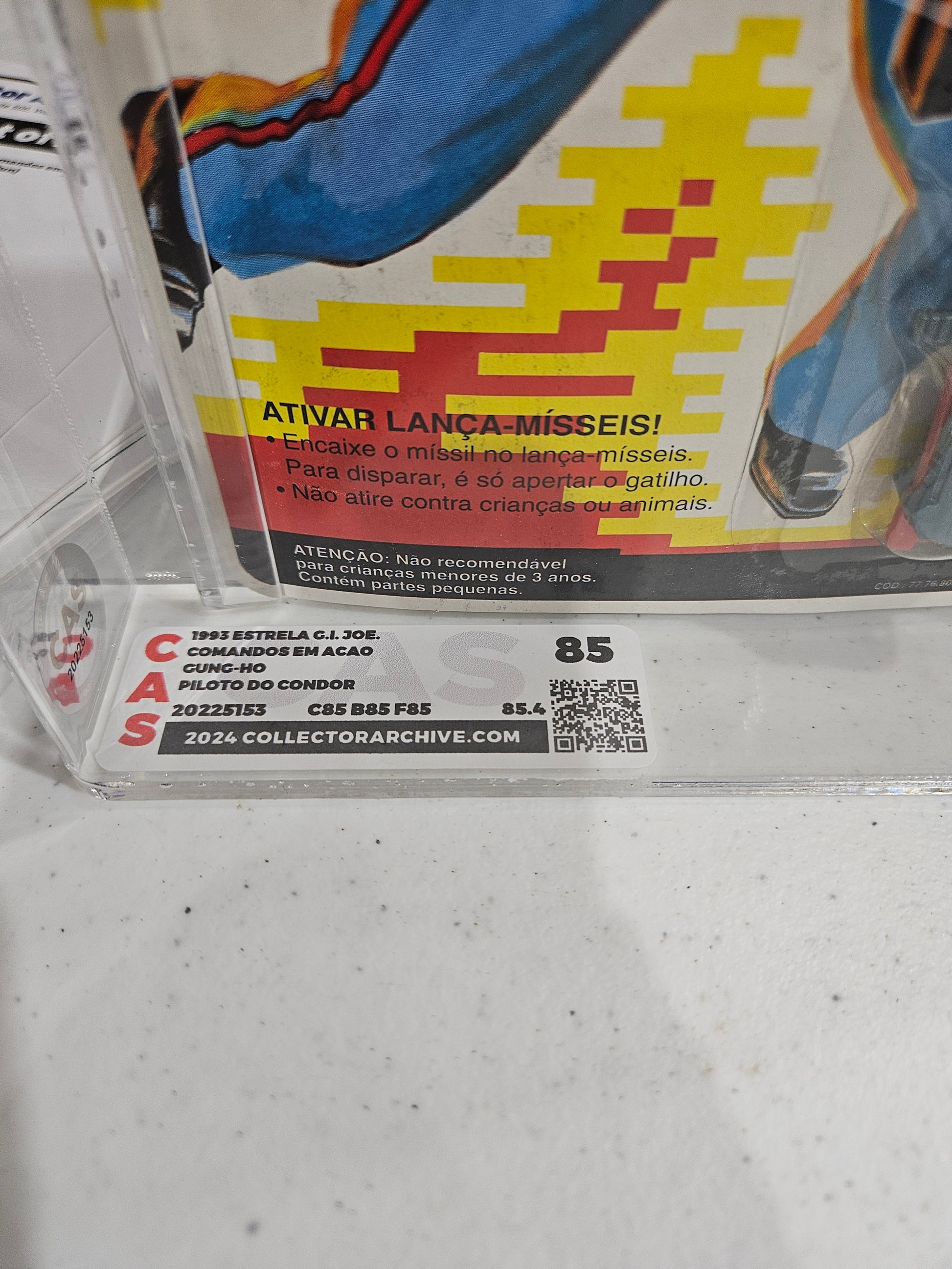 You're showcasing a rare and beautifully preserved figure from Brazil’s Comandos em Ação line: the 1993 Estrela G.I. Joe Gung-Ho, graded CAS 85 with subgrades C85 / B85 / F85, known locally as the “Piloto do Condor”—pilot of the Condor jet. This figure is a regional repaint of the classic Gung-Ho mold, reimagined for Estrela’s exclusive vehicle pack-ins.