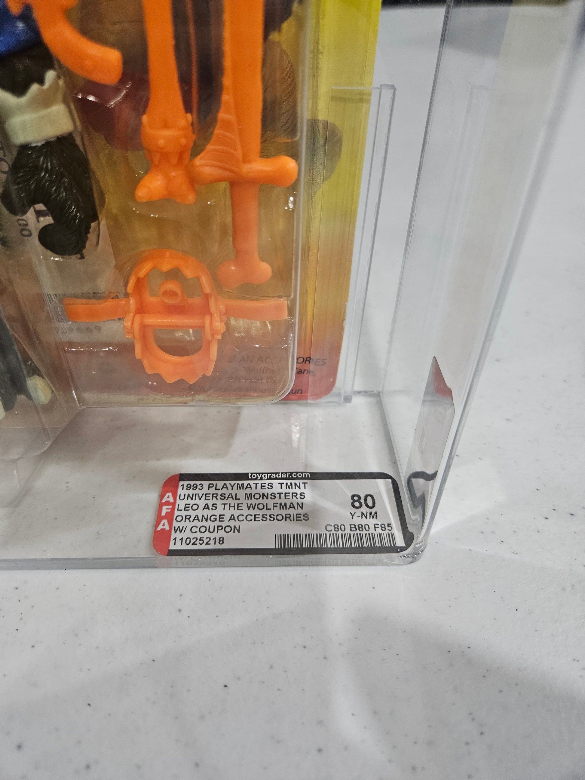 A howling crossover with archival bite! đș The 1993 Playmates TMNT Universal Monsters Leo as the Wolfman, graded AFA 80 Y-NM with subgrades C80/B80/F85, is a standout from the Universal Monsters x TMNT mashup line. With orange accessories, a coupon insert, and a yellowed blister (Y designation), this figure blends horror homage with mutant heroicsâmaking it a grail for crossover collectors and monster movie fans alike.