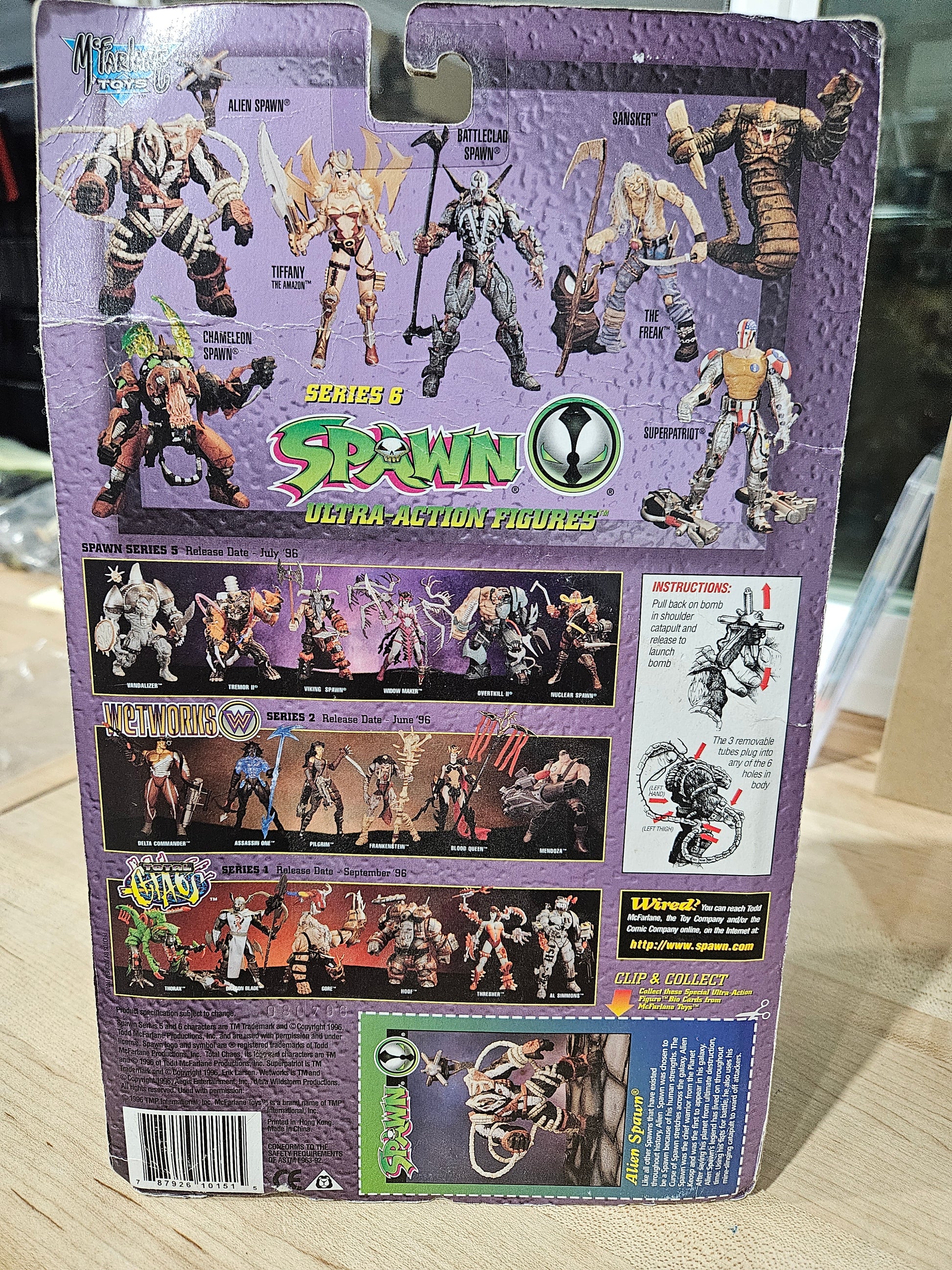 The Alien Spawn is a vintage "Ultra-Action Figure" originally released by McFarlane Toys in 1996 as part of Spawn Series 6. Standing approximately 6 to 7 inches tall, the figure is noted for its highly detailed sculpt, which features "catapult" action for launching a bomb accessory
